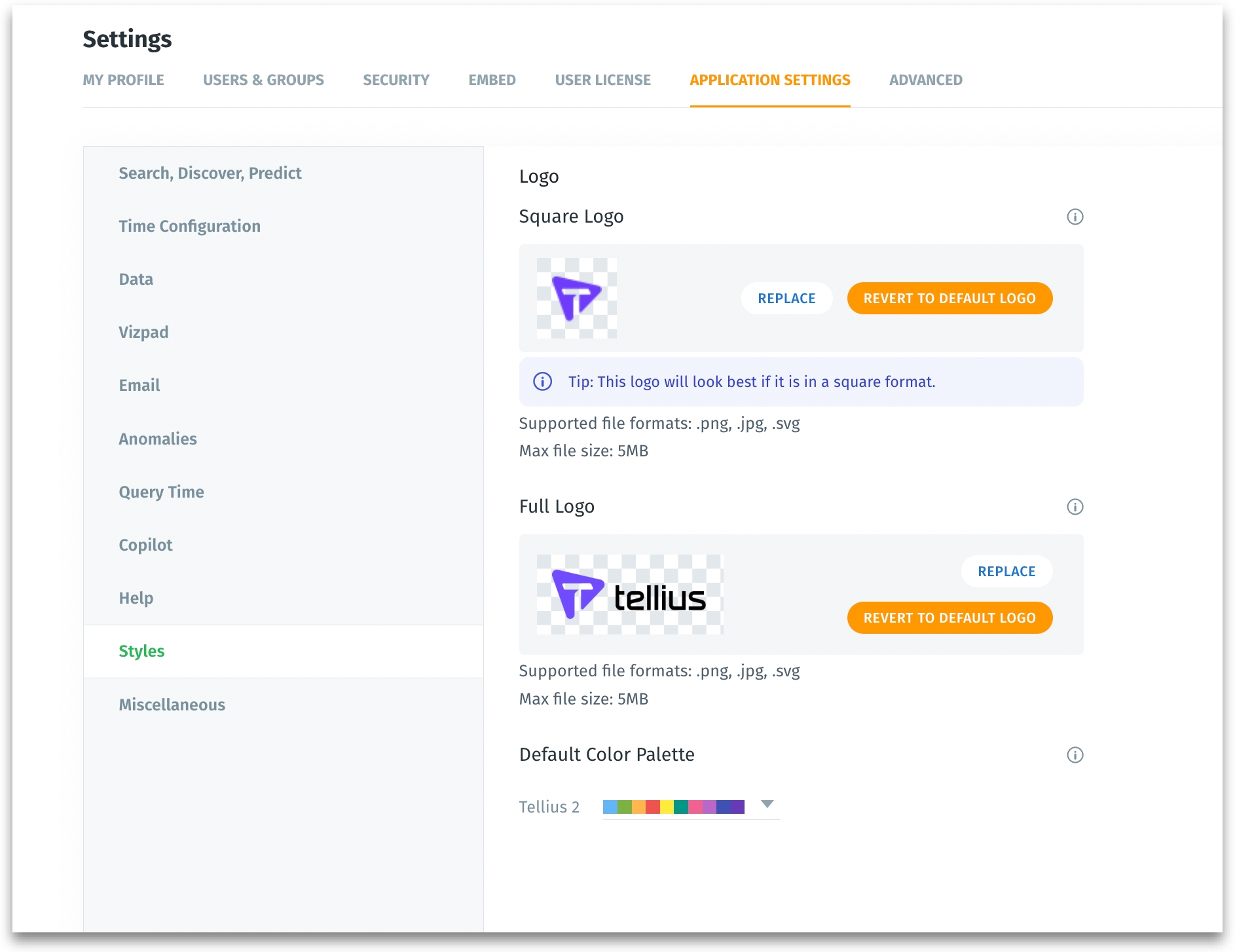 Users can now replace the default Tellius logo for a more customized experience. Under Settings → Application Settings, two types of logos (square-shaped and rectangular images) can be uploaded to be displayed in multiple places across Tellius. Additionally, users can choose the required color palette to be reflected across the platform.