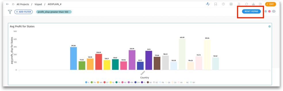 If a viewer inadvertently alters or removes filters, they can now effortlessly return the chart to its original state with the Reset Vizpad button in view-only mode. Upon using the Reset feature, the chart will instantly refresh, restoring the default filters. A confirmation message will be displayed informing users of the successful reset.