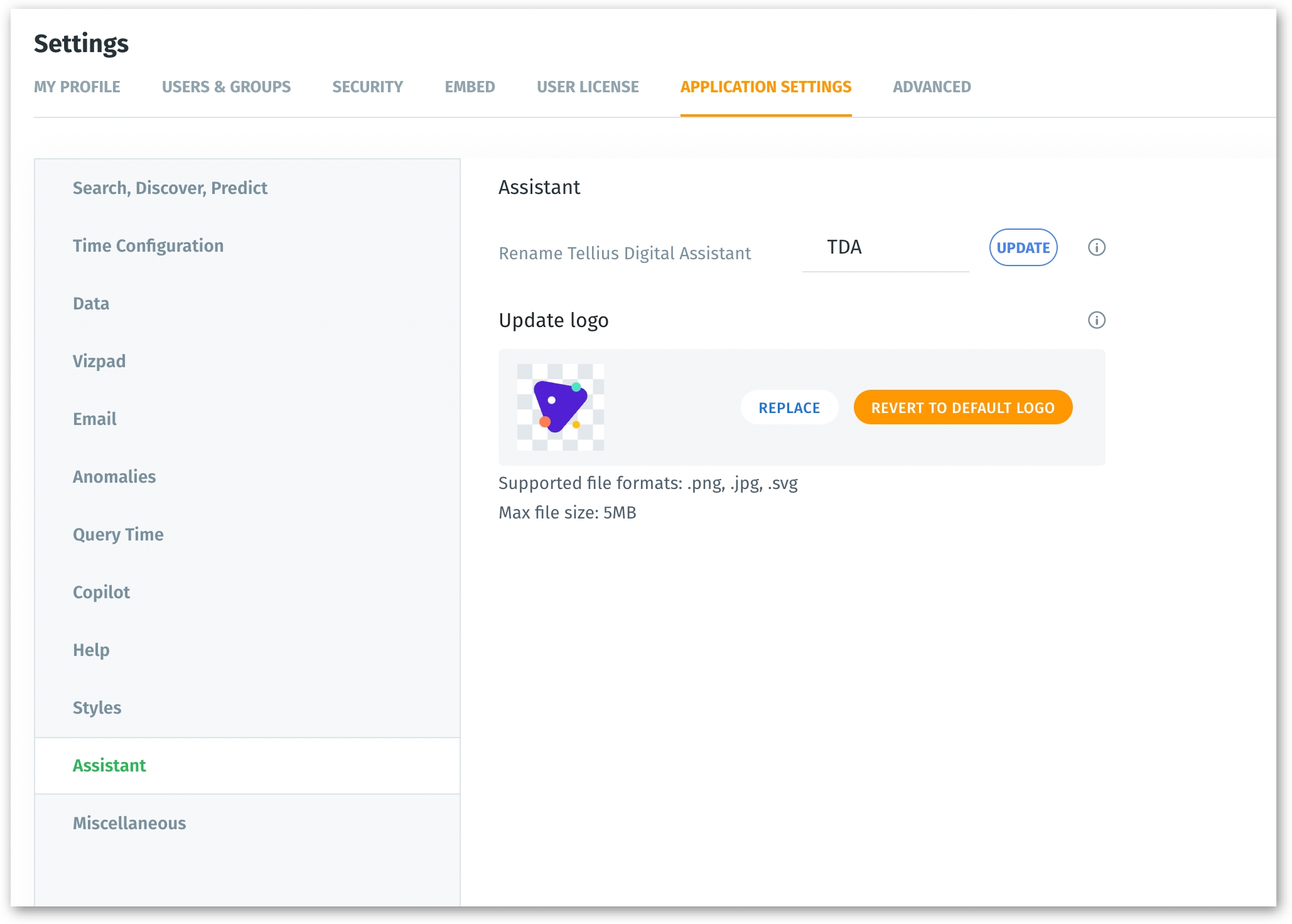 Add your logo: Align Tellius Assistant with your brand by incorporating your company's logo. Upload an image not more than 5 MB and in the accepted formats (PNG, JPG, SVG). The logo you upload will be prominently displayed on the Assistant page. It will also be featured in the chat assistant, becoming the face of all replies from Tellius Assistant. If required, the logo can be reverted to the original Tellius Assistant logo.
