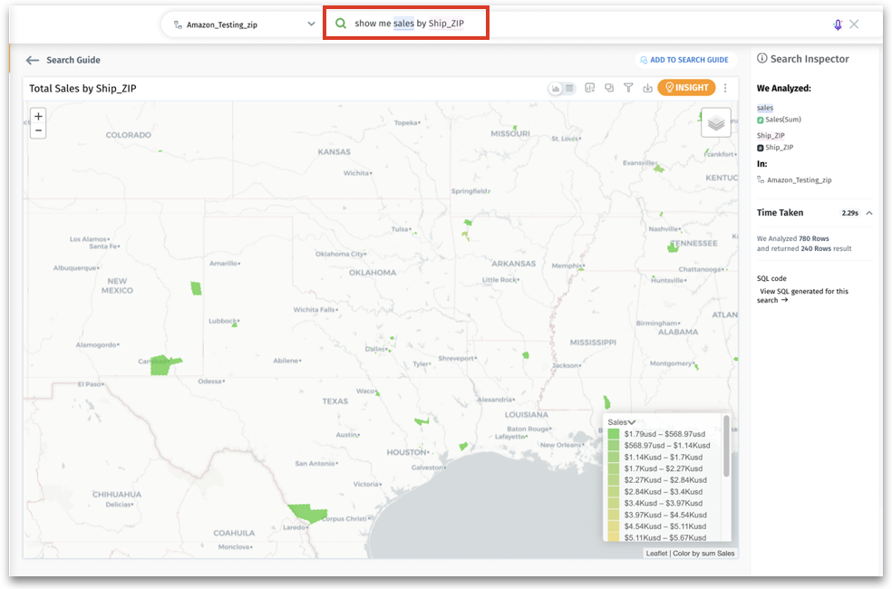 Zipcode type geographical columns are now fully supported within the search function, aligning with their existing compatibility in Vizpads. Now, just like State, County, and Country, search queries involving zip codes will automatically integrate boundary maps for a more detailed geographic analysis. This improvement enables more precise location-based results directly from the search interface.