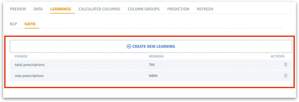 Example: For any healthcare-related BV, you want the term "new prescriptions" to be interpreted as "NBRX" and "total prescriptions" as "TRX." Once you define these terms under Data → Business View → Learnings → Kaiya for a specific BV, queries related to that particular BV mentioning "new prescriptions" will be mapped to the "NBRX" column, and queries mentioning "total prescriptions" will be mapped to the "TRX" column.