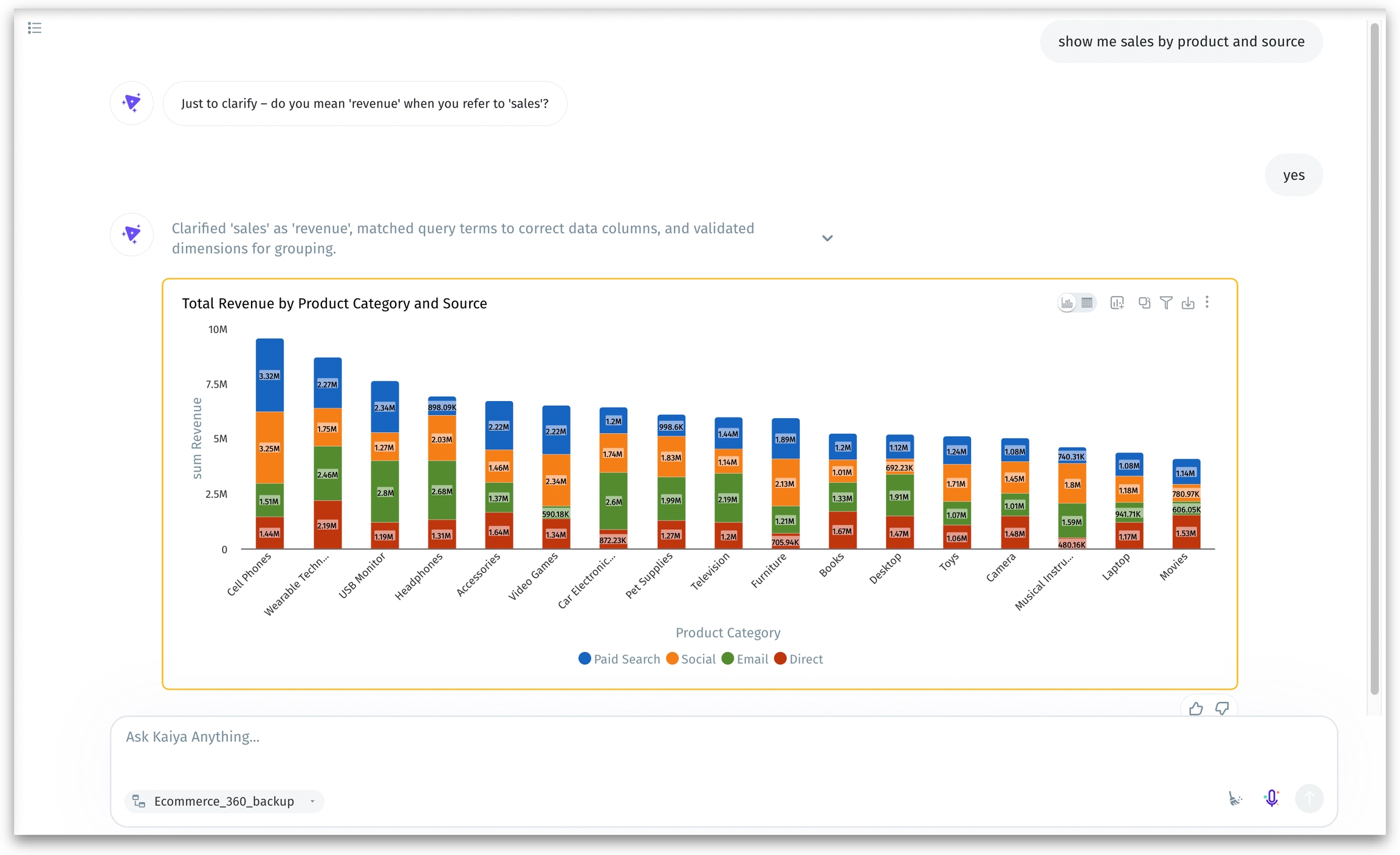 Kaiya now intelligently prompts users with clarification questions when their initial query may be ambiguous—ensuring more accurate results. For example, if a user asks for “performance”, Kaiya may ask if they actually mean revenue, profit, or another metric. This interactive step refines the intent early on, reducing errors and aligning the output with user expectations. Once clarified, Kaiya proceeds with interpreting, selecting the right data fields, leading to more accurate charts and summaries.