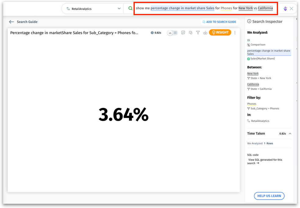 In Search, Tellius now provides out-of-the-box support for "change in market share" queries with the following syntax: