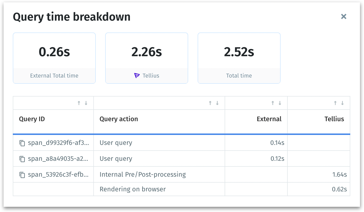 Tellius now provides users with enhanced visibility into the time required for executing each query and rendering the results, specifically when queries are run on live data sources. In Vizpads and Search, the platform actively tracks and displays the time consumed by both Tellius and any external data sources, giving users a clearer understanding of query performance. This feature is crucial for identifying bottlenecks in query performance, particularly when performance is impacted by queries being executed directly on sources like Snowflake, Redshift, Azure, and more.