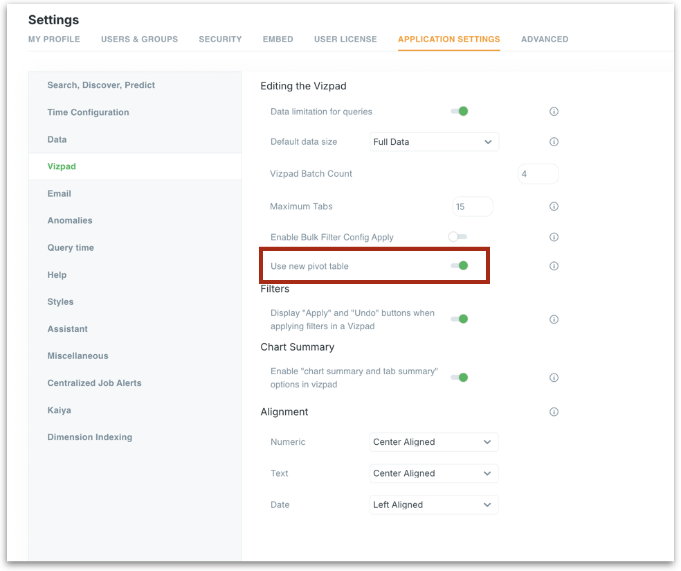 You can now turn on or off the new hierarchical pivot tables—with grouping and easy expand/collapse—under Settings → Application Settings → Vizpad → Use new pivot table toggle.
