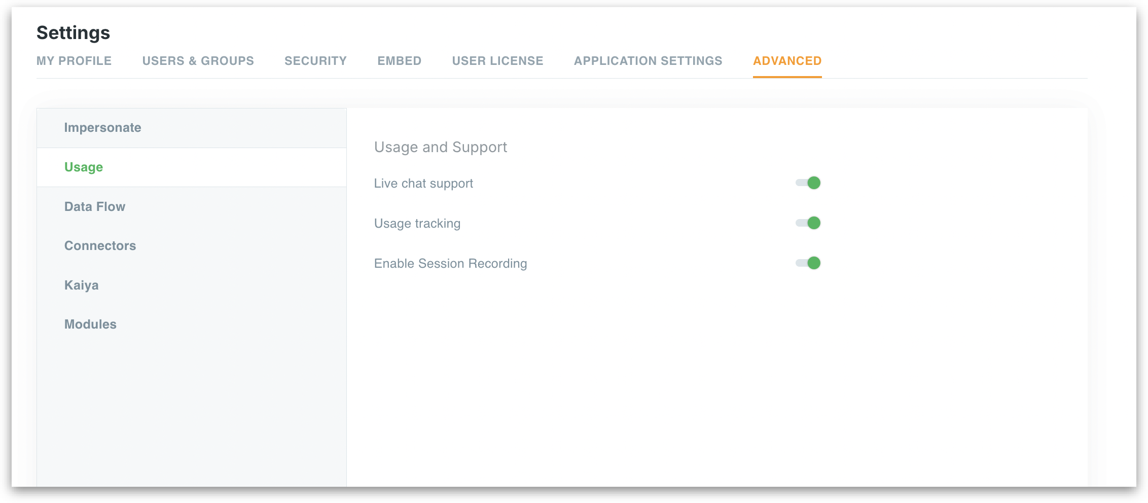 You can now manage session recordings directly from Settings → Advanced → Usage → Enable Session Recording. When enabled, all activities performed during your session will be automatically recorded, giving visibility into your usage activity.