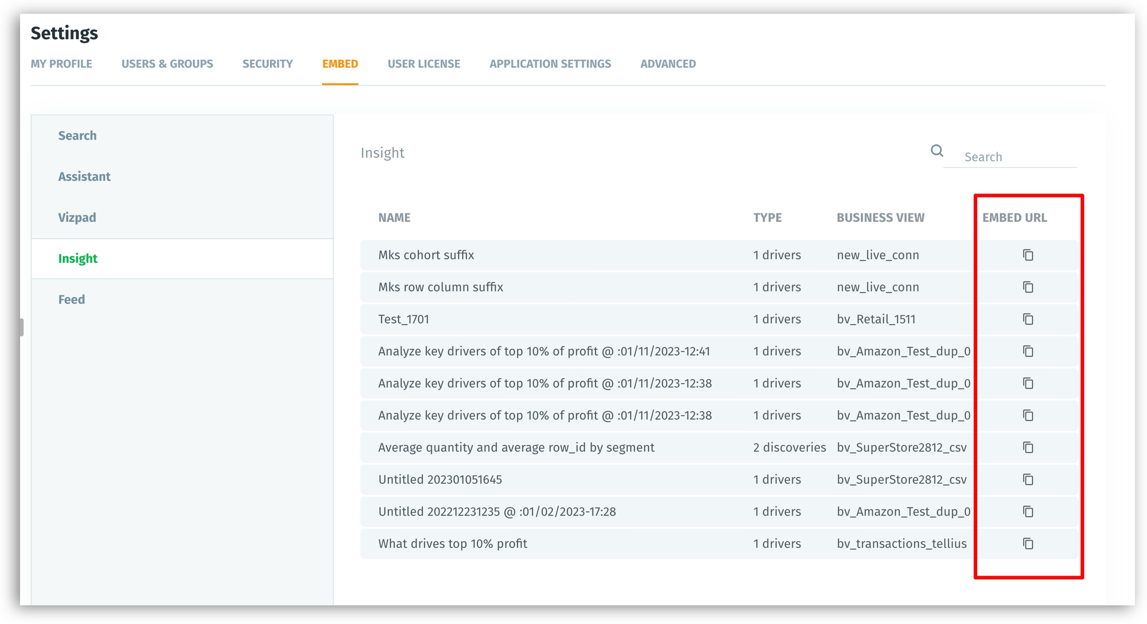 Navigate Settings → Embed → Insight. The list of existing Insights is displayed.