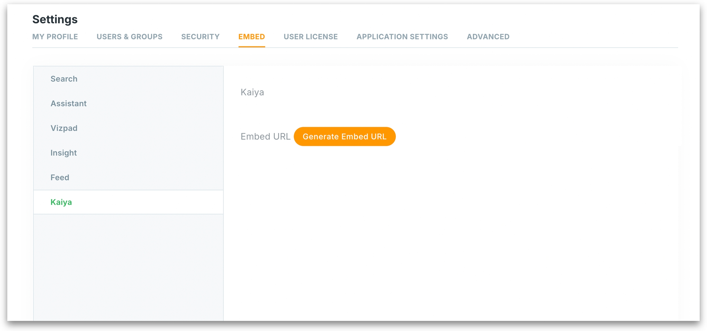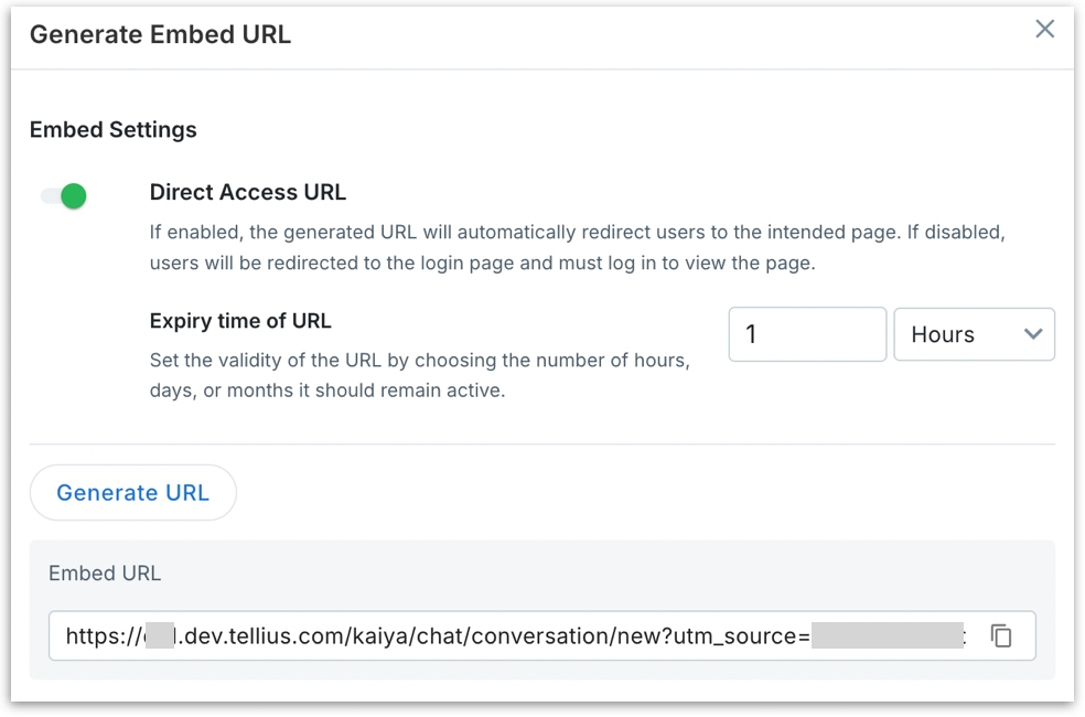 Under Settings → Embed → Kaiya, click on Generate Embed URL to view the embedding URL window.
