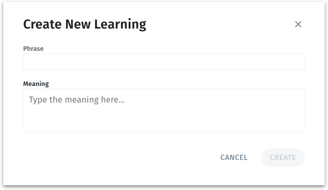 Under Learning Phrase, provide a phrase which you want to be interpreted in a specific way. Under Meaning, provide the actual meaning which needs to be replaced for the phrase and click on Create.
