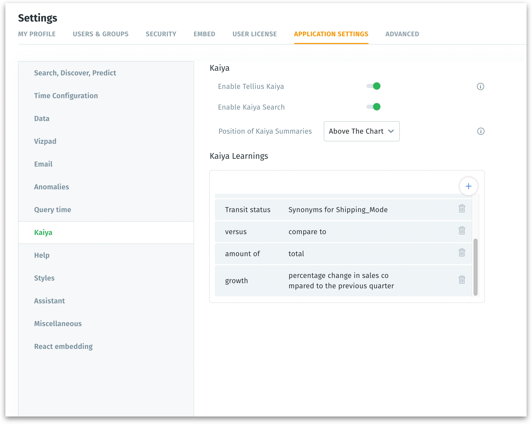 Click on the Settings → Application Settings → Kaiya → Kaiya Learnings.