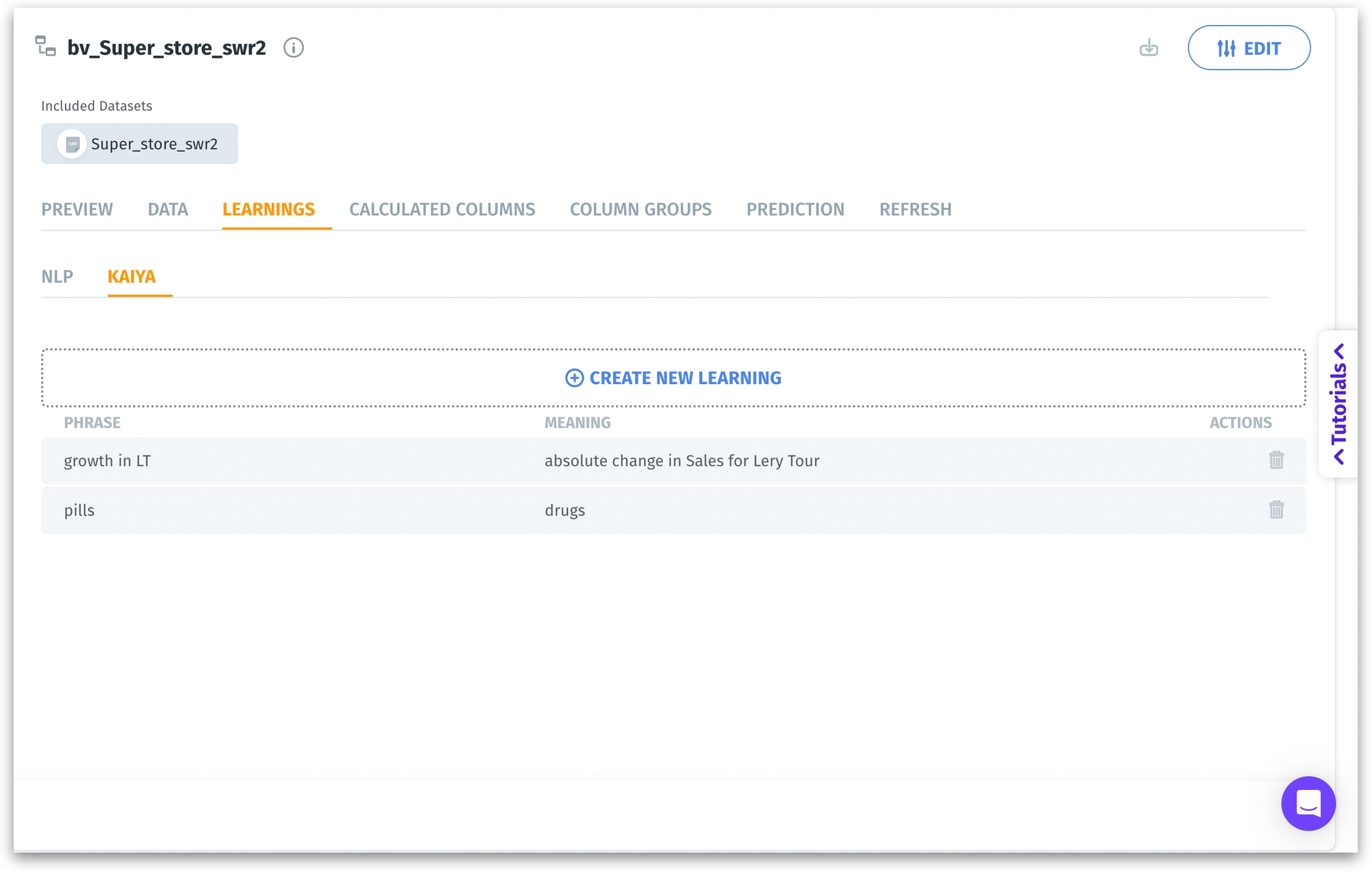 Click on the user icon and navigate to Data → Business View → Learnings → Kaiya.