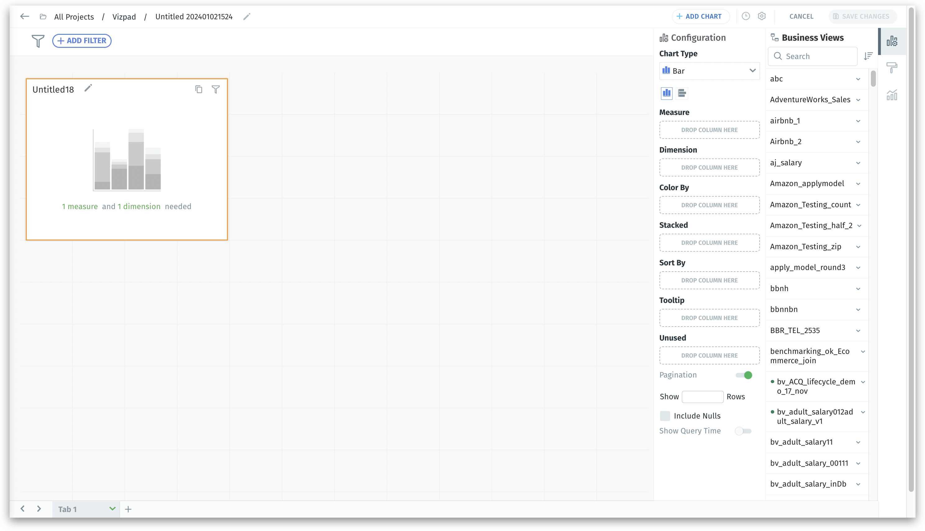 Here, you can build charts by dragging and dropping (or double-clicking on) the required columns from the selected Business View. Enhance the charts further by applying aggregation and filters in multiple fields.