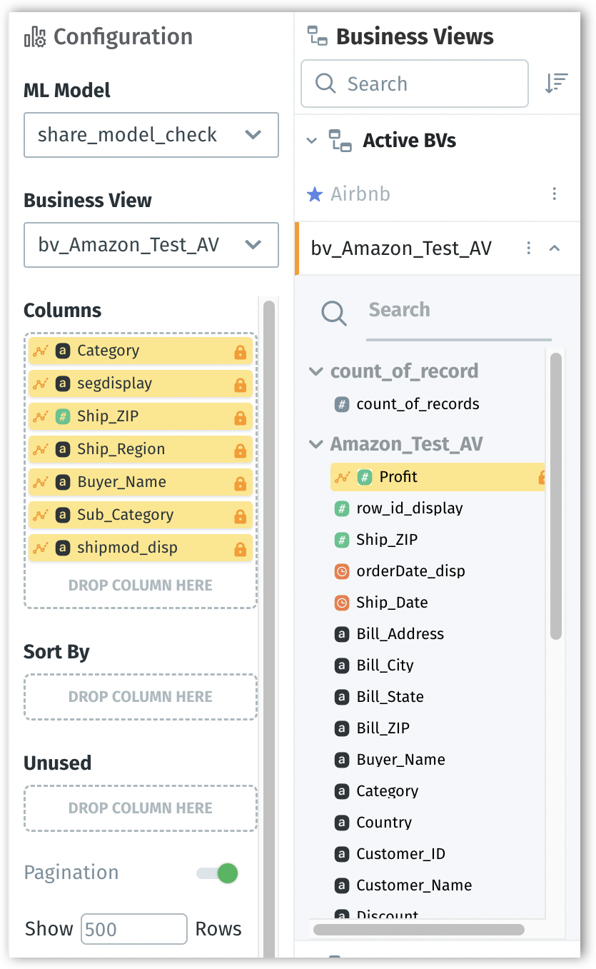 From that model, select the required Business View from a list of Business Views used by the ML-Model.