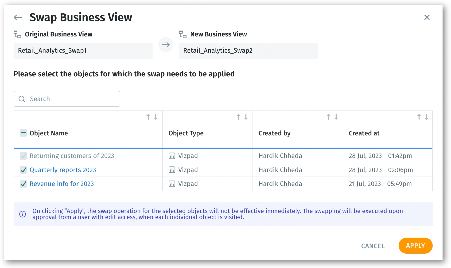 Please note that after clicking on "Apply", the swapping of Business Views will be configured, but will not be effective immediately. For more details, check out this page.