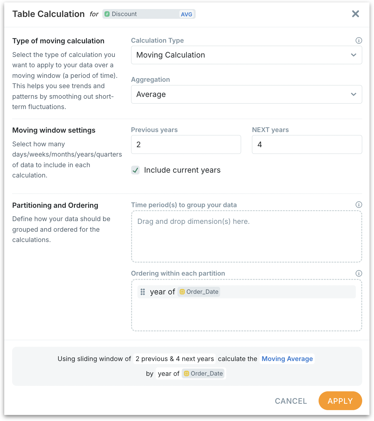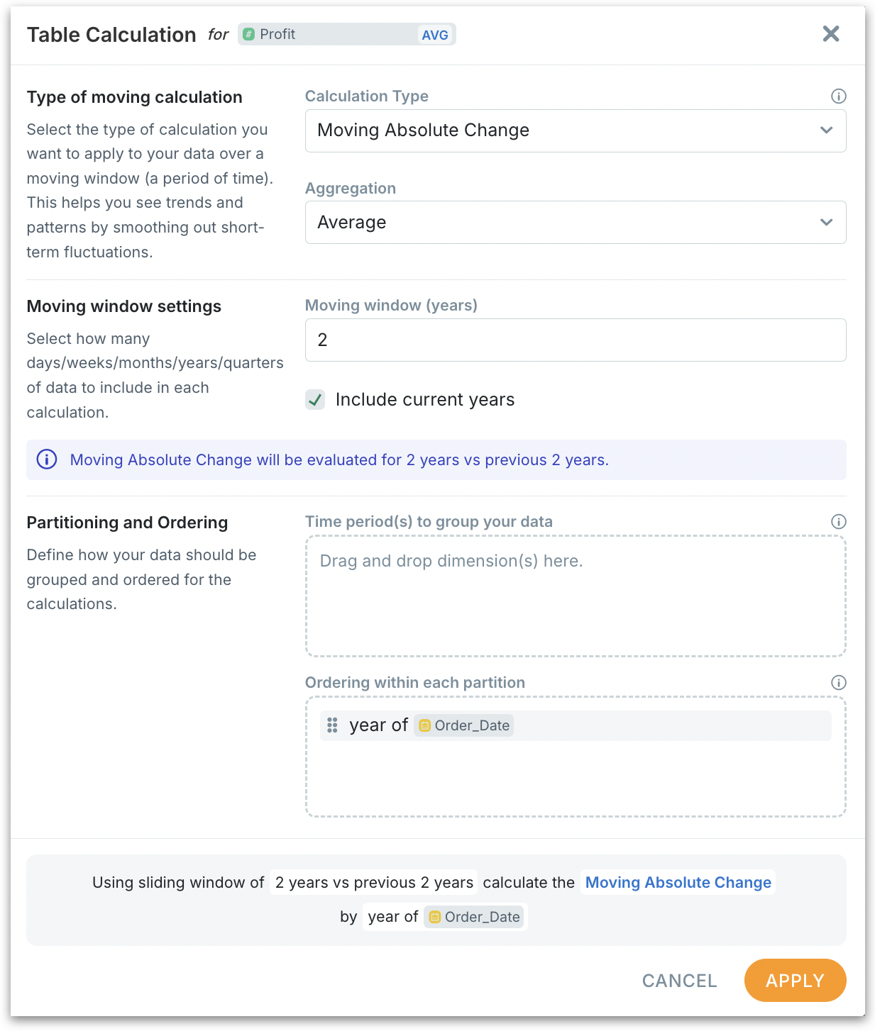 Example (Ordering = year of Order_Date, Moving window = 2, Include current = ON, at 2024):