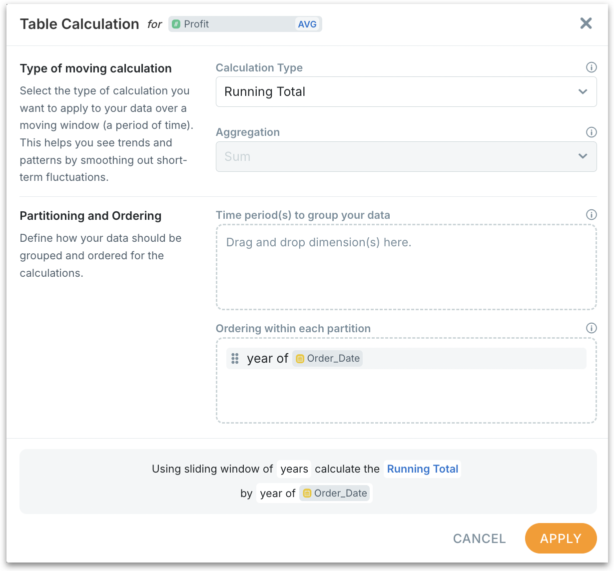 Configuration is the same as moving calculation except there won't be Moving window settings. Running Total is cumulative by design—its “window” is implicitly from the first ordered period up to the current one inside each partition. That’s why there are no moving-window fields (no Previous/Next or Moving window (…)). The only thing you specify is the time order (e.g., year of Order_Date) and optional partitions (where the cumulative resets).