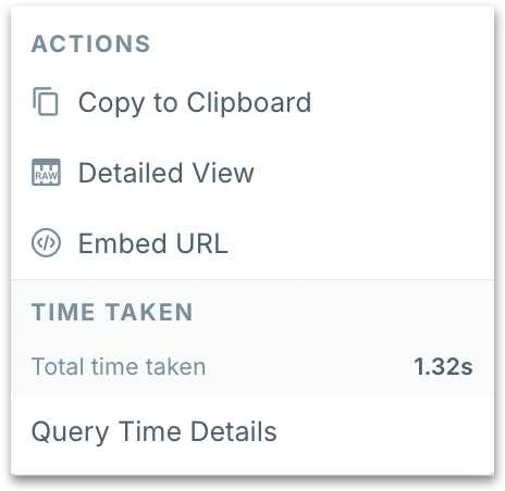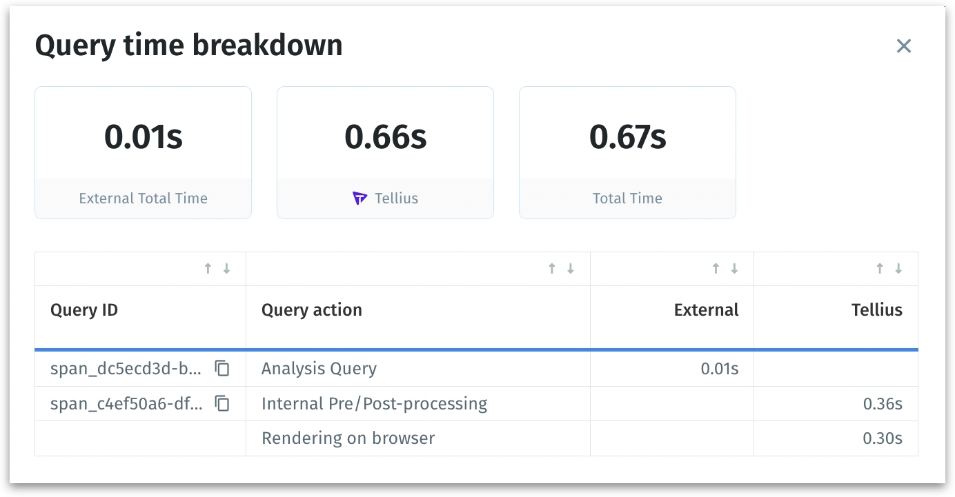 c. Time taken - The time taken to load the chart by Tellius and other external engines will be displayed. Click on Query time details to view the complete breakdown. For more details, check out this page.