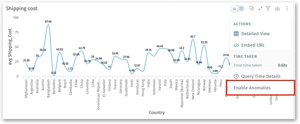 For any line chart, click on the three-dot kebab menu and select Enable Anomalies to display the anomalies or Disable Anomalies to hide the anomalies.
