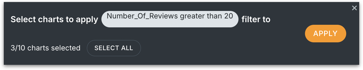 You can select the required charts and the count will be increased accordingly in the panel. **Select all** selects all the visuals in the tab, and the filter will be applied to the selected charts once you click on **Apply**.