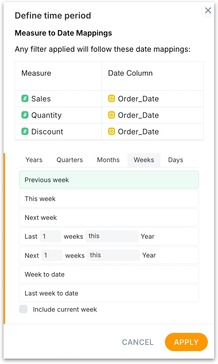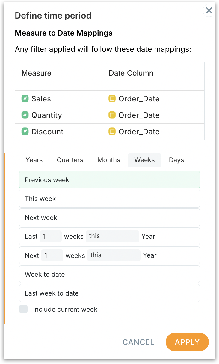 Click on the Select time period field and the following window will be displayed. The available Measure → Date mappings for the Business View will be listed.
