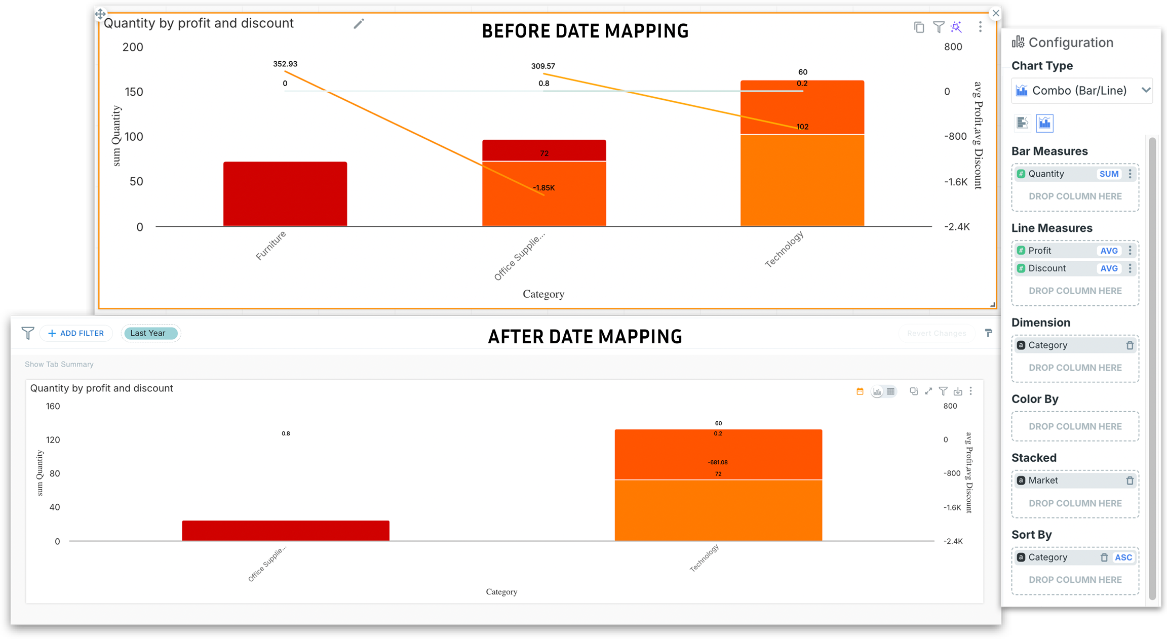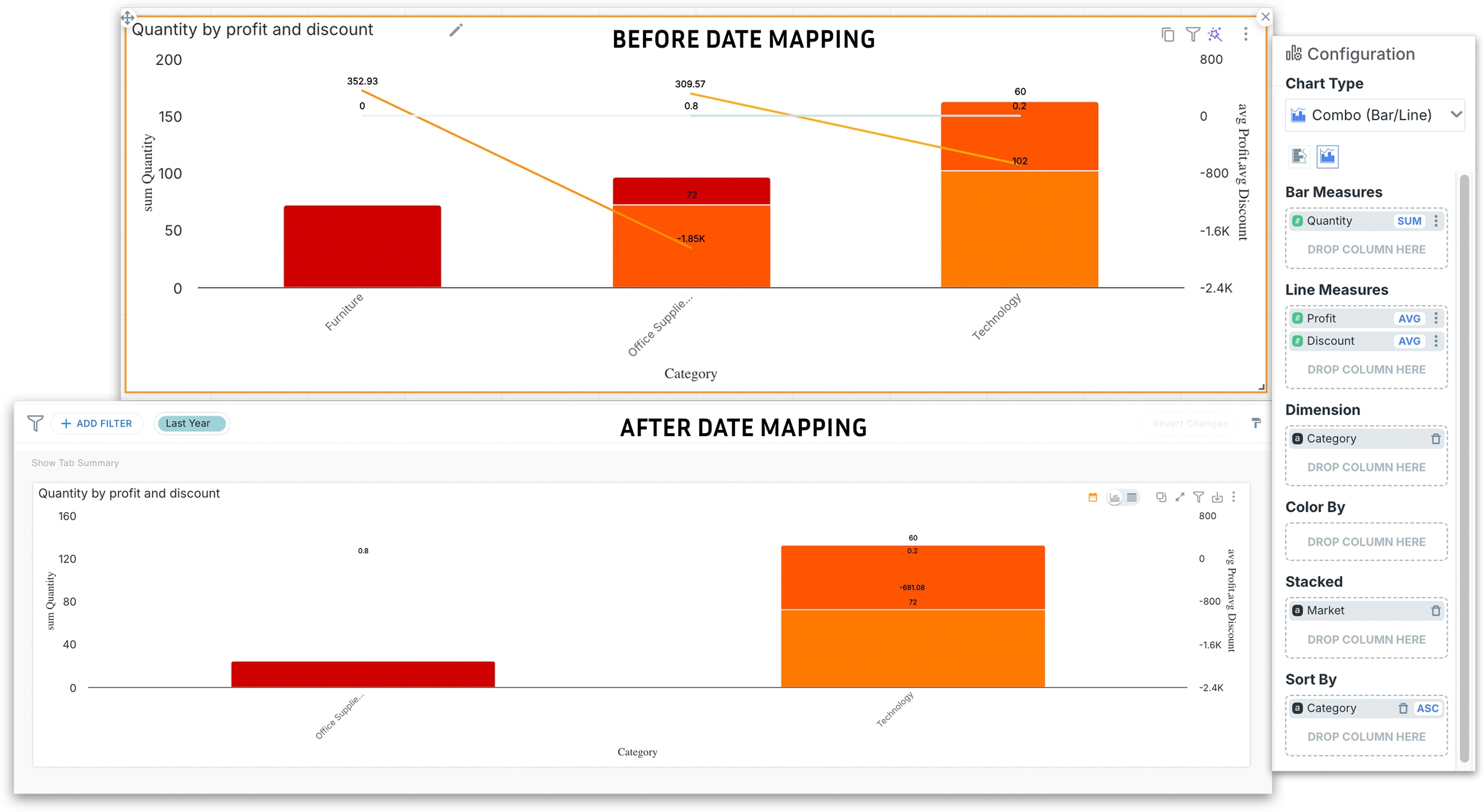 Without mapping, the time filter could have hit a different date column or been applied across measures. Mapping forces the filter to use the correct date per metric, so your bars and lines are apples-to-apples for “last year.”
