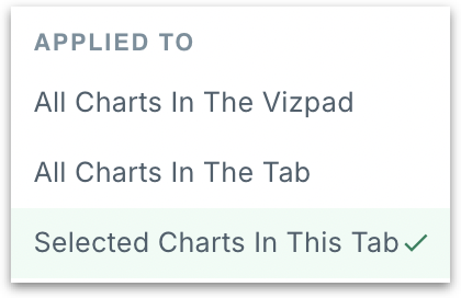 If you want to apply a global filter (for all charts in all tabs), then select All charts in the Vizpad. All subsequent filter configurations apply to every Vizpad tab.