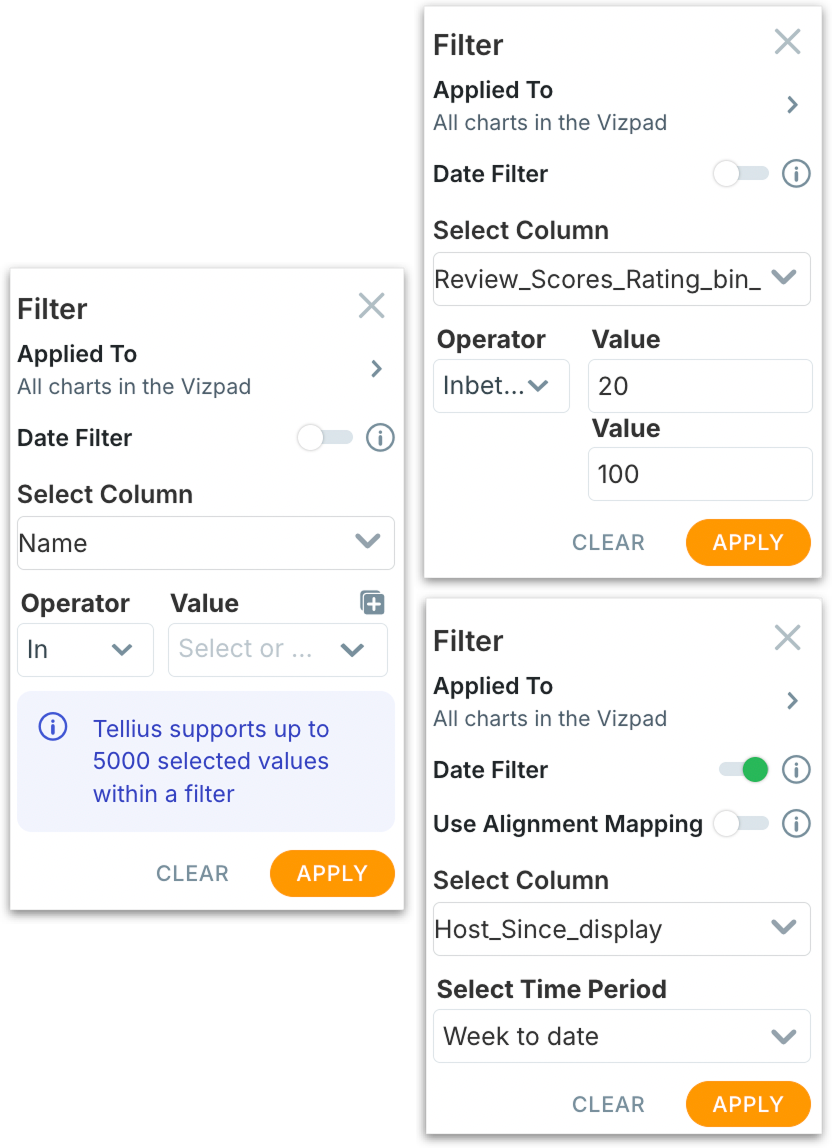 Learn how to apply Tellius global filters across Vizpad tabs for consistent data context. Configure date, measure, and dimension filters to align charts accurately.