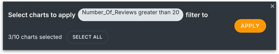 You can select the required charts and the count will be increased accordingly in the panel. Select all selects all the visuals in the tab, and the filter will be applied to the selected charts once you click on Apply.