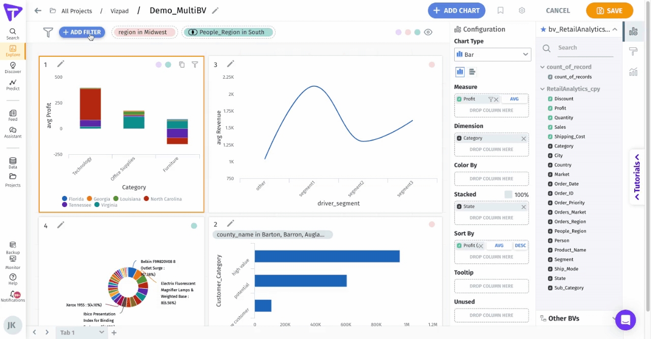 If you create a chart using a Business View (e.g., "Customer Success") that shares a common column (like "revenue") for which a filter has already been applied, the chart will automatically use that "revenue" filter. This ensures your data remains consistent, and filters get reflected with newly created charts across different Business Views.
