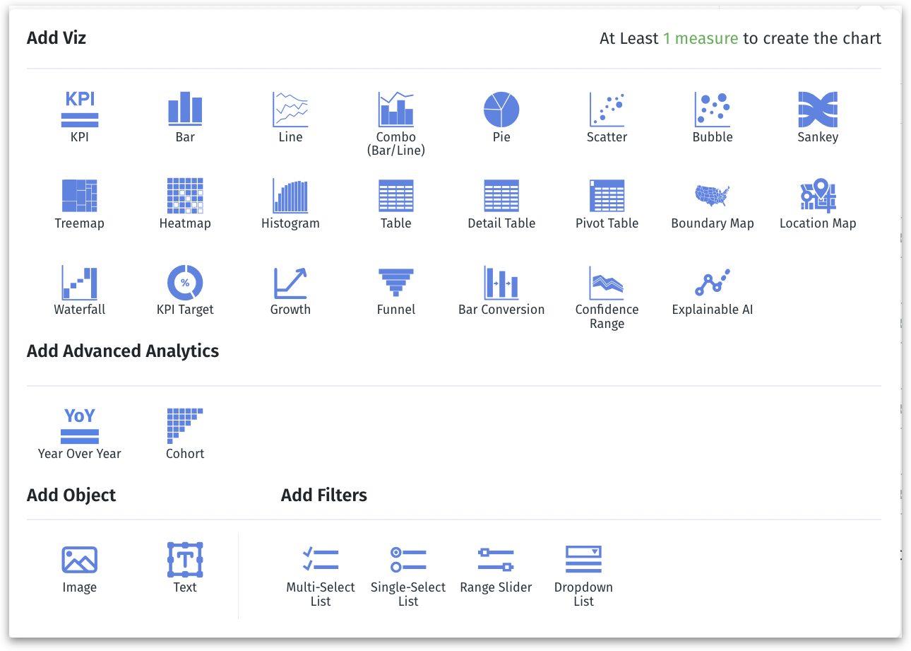In addition to charts, you can also add objects (text and images) and control filters.
