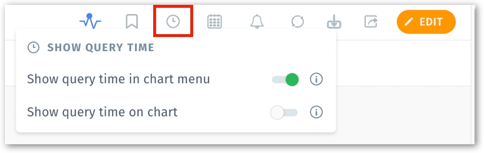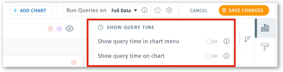 If the Show query time on chart toggle is disabled, then the details of the time taken to execute a query will not be displayed on every chart.