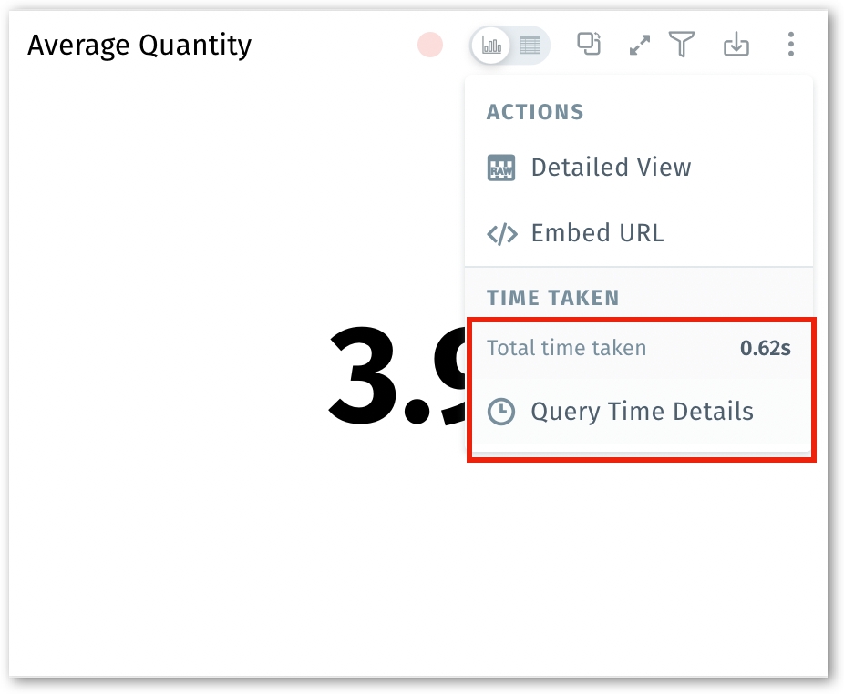 If Show query time in chart menu is enabled, then the details of the total time taken to execute a query will be displayed in the three-dot kebab menu of every chart.