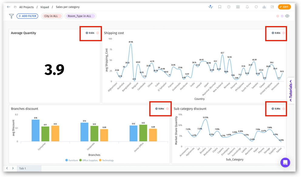 For both View and Edit modes, Tellius displays the time taken by Tellius and external resources to execute the query and load every chart in a Vizpad.