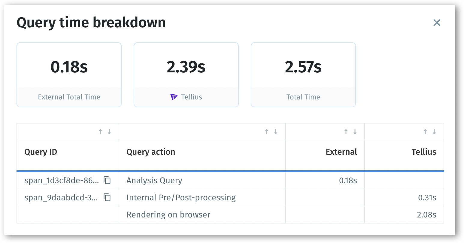 Click on the Query Time Details to view the breakdown of the query executed. Each query's comprehensive details, including the ID, description, and the resource in which it was executed, will be displayed.