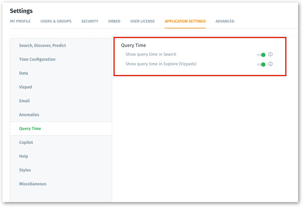 Admins can now enable/disable the display of query time inspector for Search and Vizpads. Under Settings → Application Settings, admins can choose whether they want to display the time taken to execute every search query.