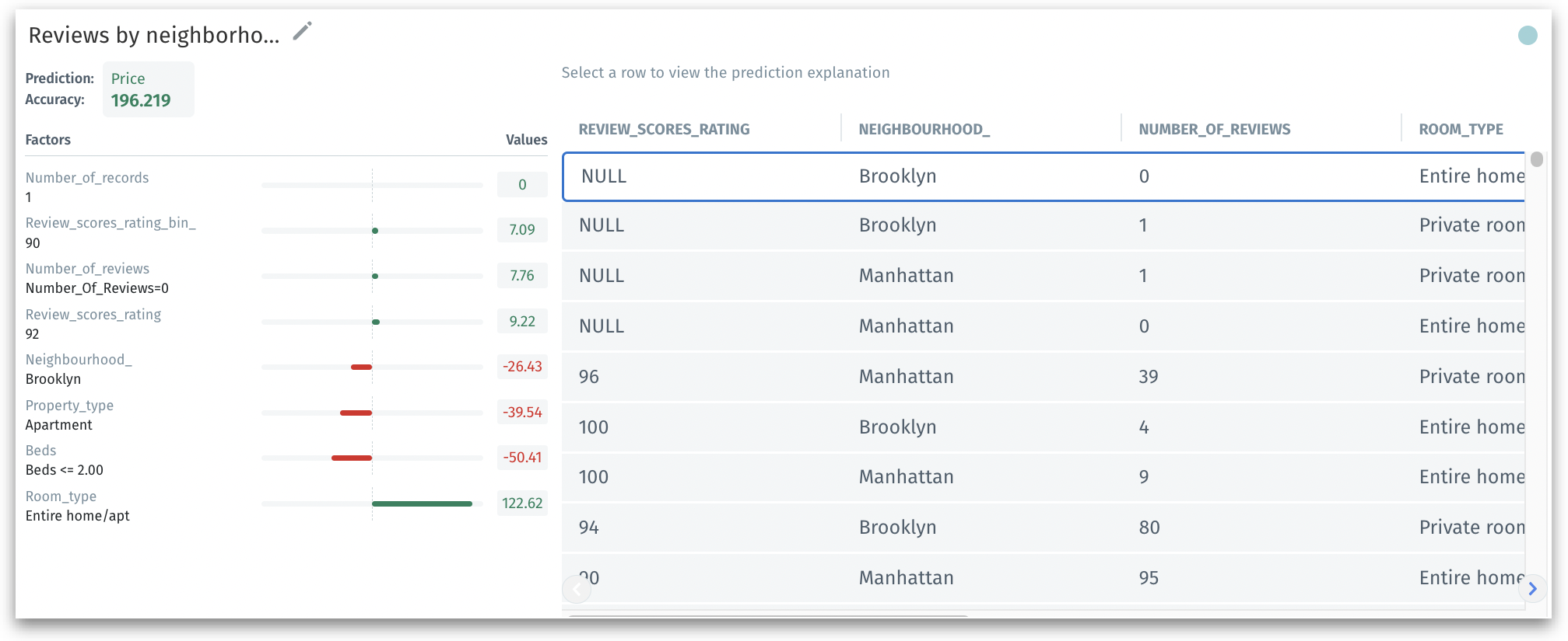 In Vizpads, we have introduced explainable AI charts that allow users to easily visualize and understand the factors influencing their machine learning model's predictions. It offers insights into the underlying reasons behind each prediction, ensuring users can make more informed decisions and better mitigate potential risks. This chart is composed of two essential sections: a table displaying all columns in the Business View with an option to select specific rows, and a detailed breakdown of the factors influencing the predicted value for the chosen row.