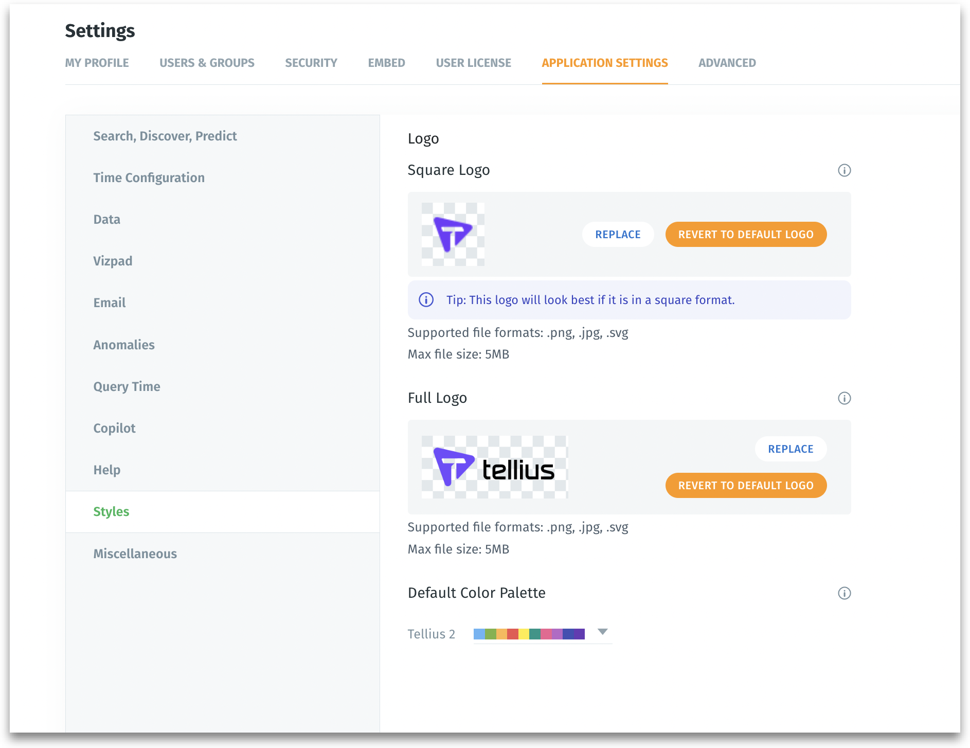 Users can now replace the default Tellius logo for a more customized experience. Under Settings → Application Settings, two types of logos (square-shaped and rectangular images) can be uploaded to be displayed in multiple places across Tellius. Additionally, users can choose the required color palette to be reflected across the platform.