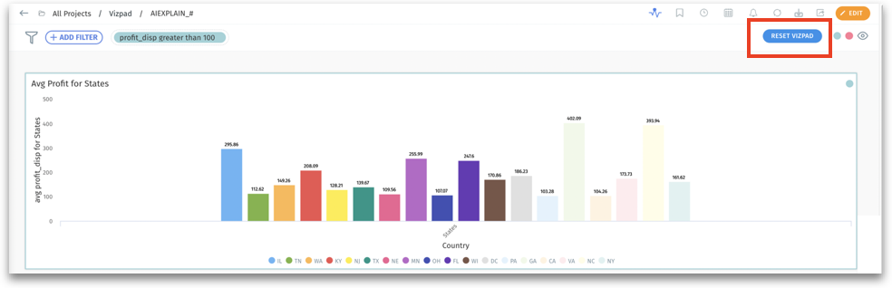 If a viewer inadvertently alters or removes filters, they can now effortlessly return the chart to its original state with the Reset Vizpad button in view-only mode. Upon using the Reset feature, the chart will instantly refresh, restoring the default filters. A confirmation message will be displayed informing users of the successful reset.