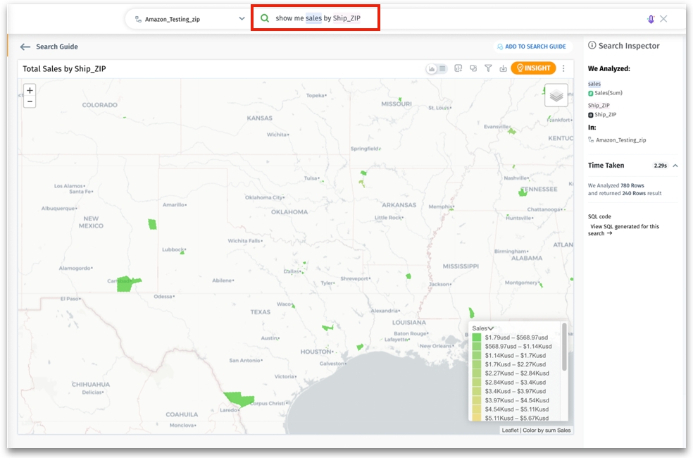 Zipcode type geographical columns are now fully supported within the search function, aligning with their existing compatibility in Vizpads. Now, just like State, County, and Country, search queries involving zip codes will automatically integrate boundary maps for a more detailed geographic analysis. This improvement enables more precise location-based results directly from the search interface.